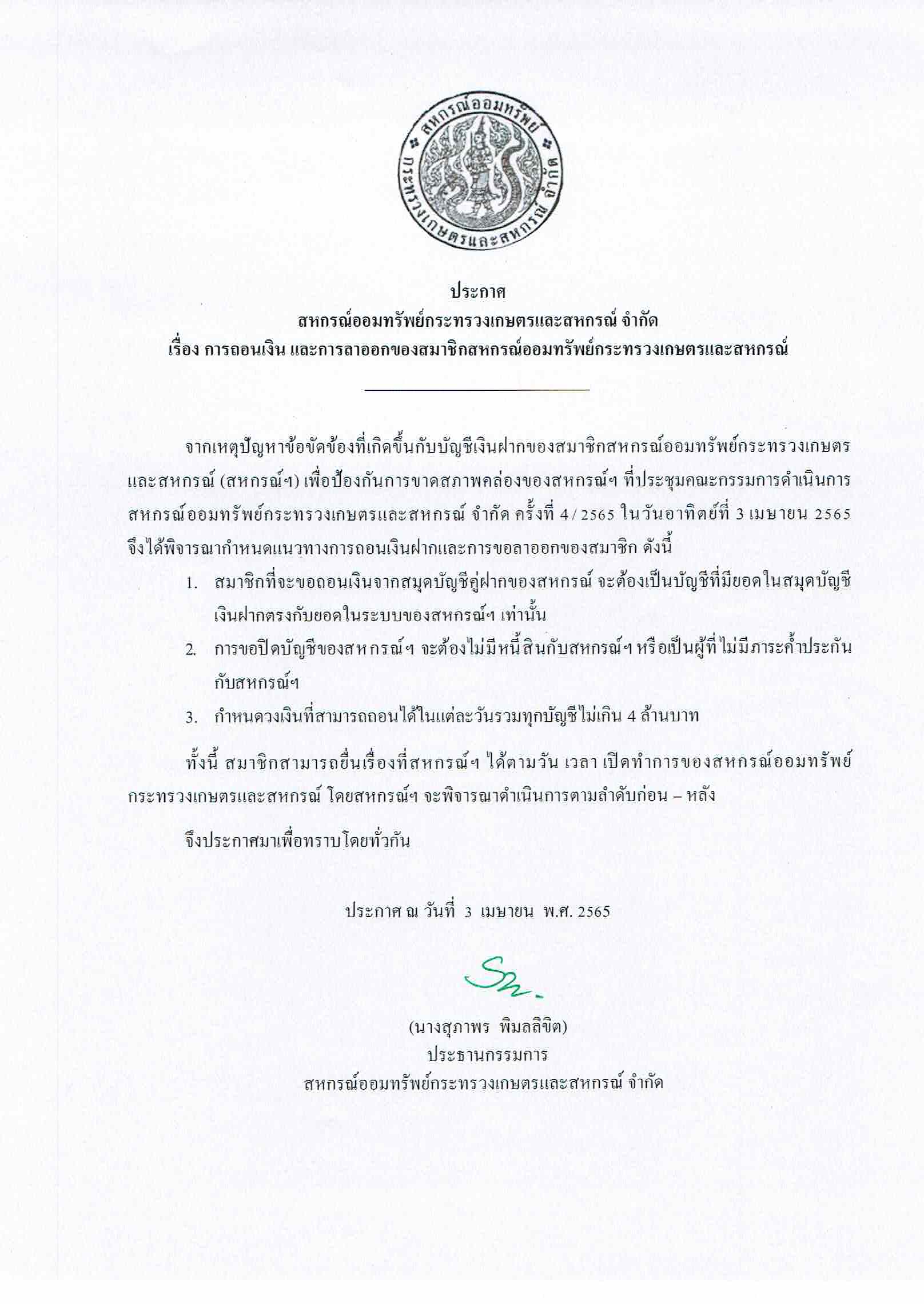 เรื่องการถอนเงิน และการลาออกของสมาชิกสหกรณ์ออมทรัพย์กระทรวงเกษตรและสหกรณ์