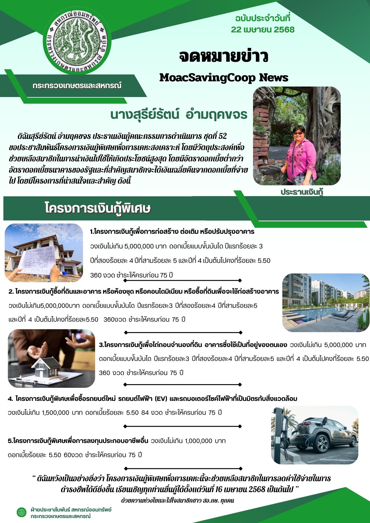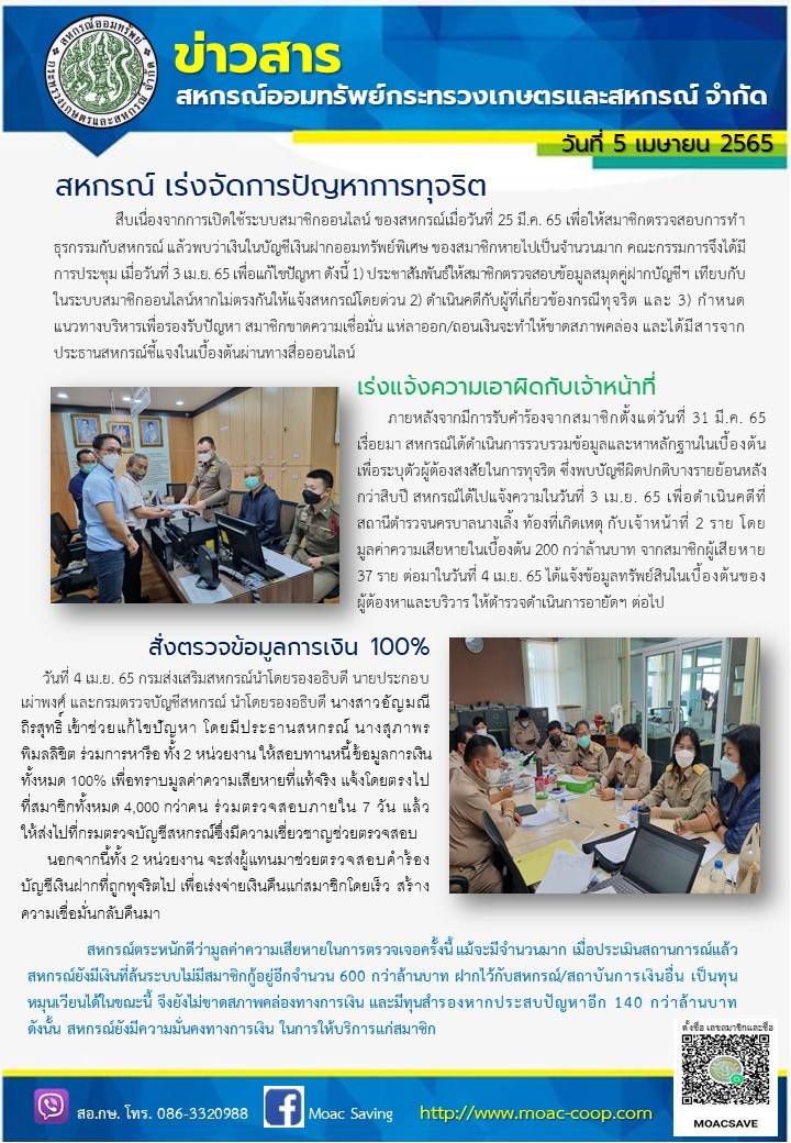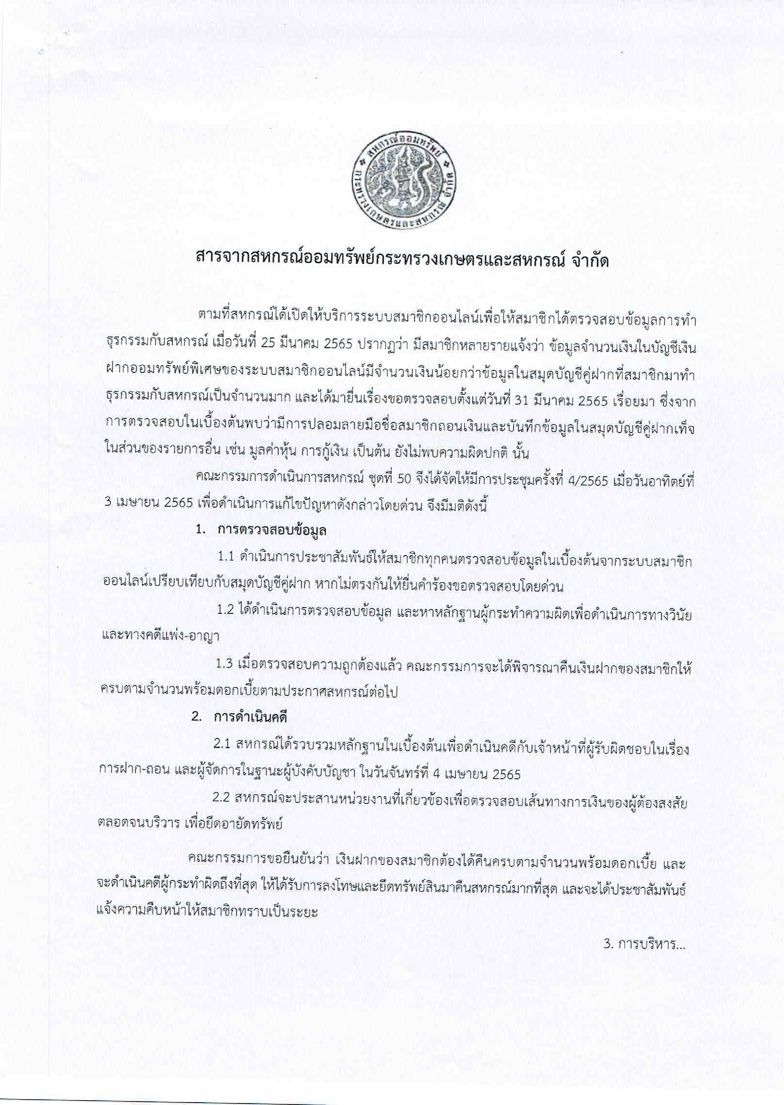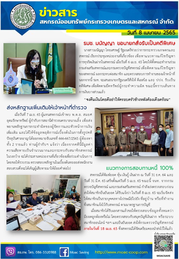 ข่าวสาร สหกรณ์ออมทรัพย์กระทรวงเกษตรและสหกรณ์ วันที่ 8 เมษายน 2565