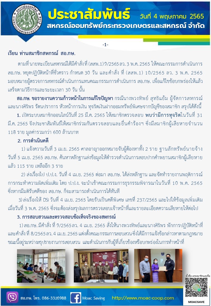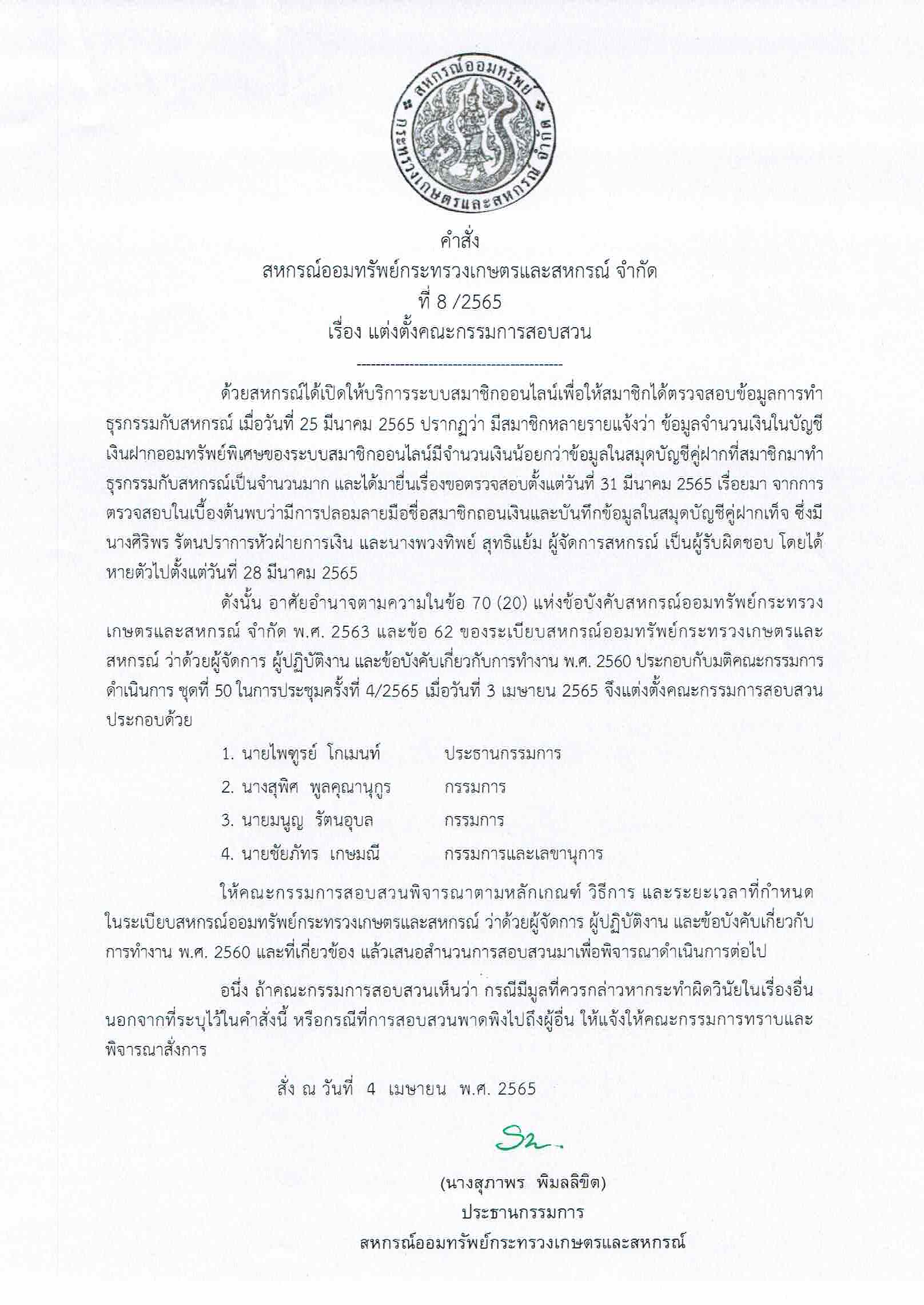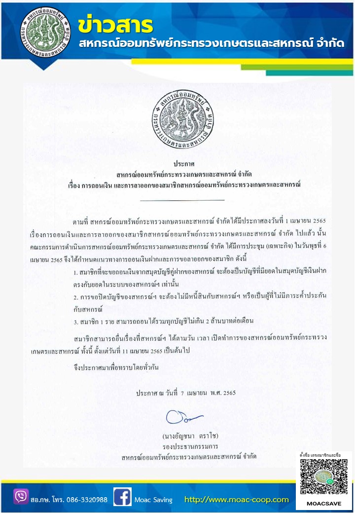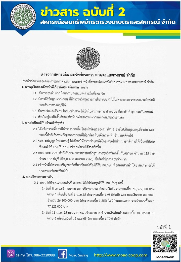 ข่าวสาร สหกรณ์ออมทรัพย์กระทรวงเกษตรและสหกรณ์ วันที่ 8 เมษายน 2565