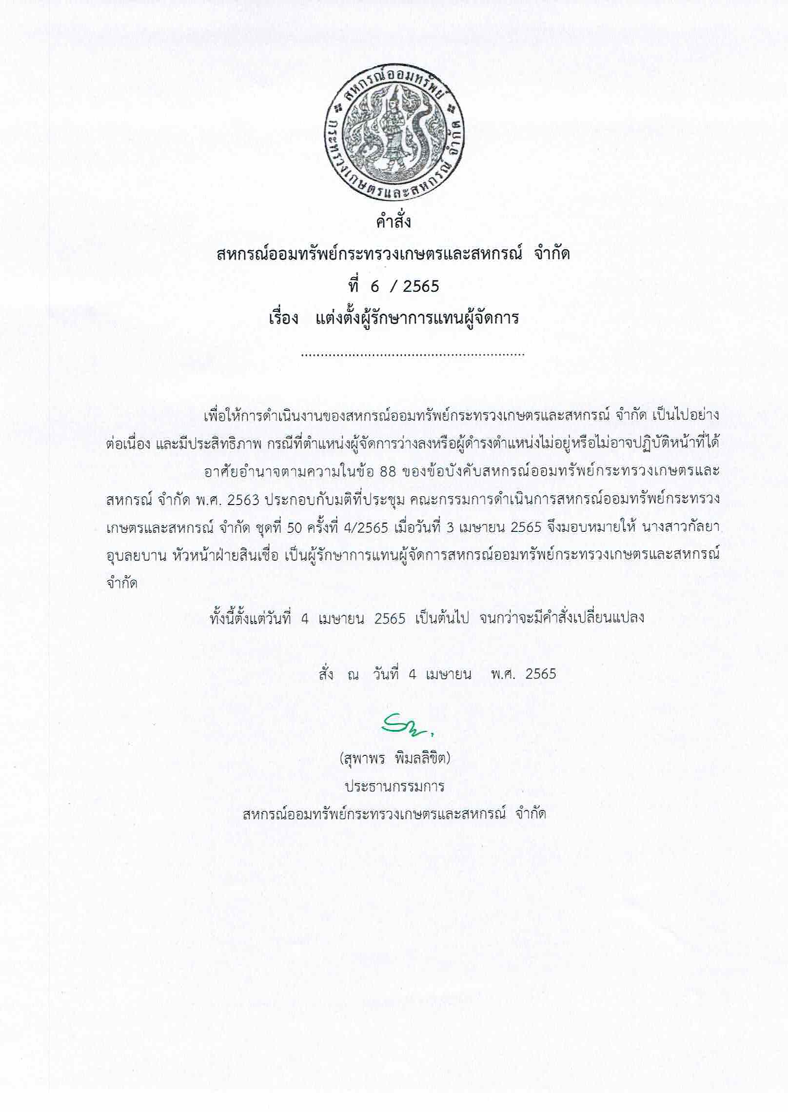 คำสั่งที่ 6/2565 แต่งตั้งผู้รักษาการแทนผู้จัดการ