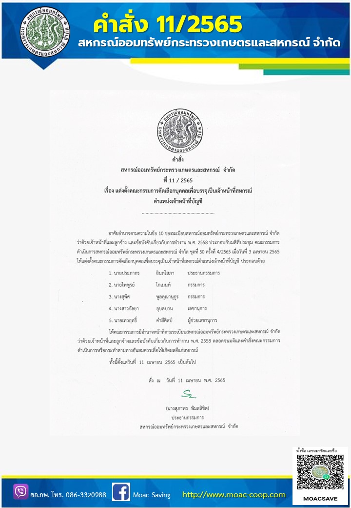 คำสั่งที่ 11/2565 แต่งตั้งคณะกรรมการคัดเลือกบุคคลเพื่อบรรจุเป็นเจ้าหน้าที่สหกรณ์ ตำแหน่งเจ้าหน้าที่บัญชี