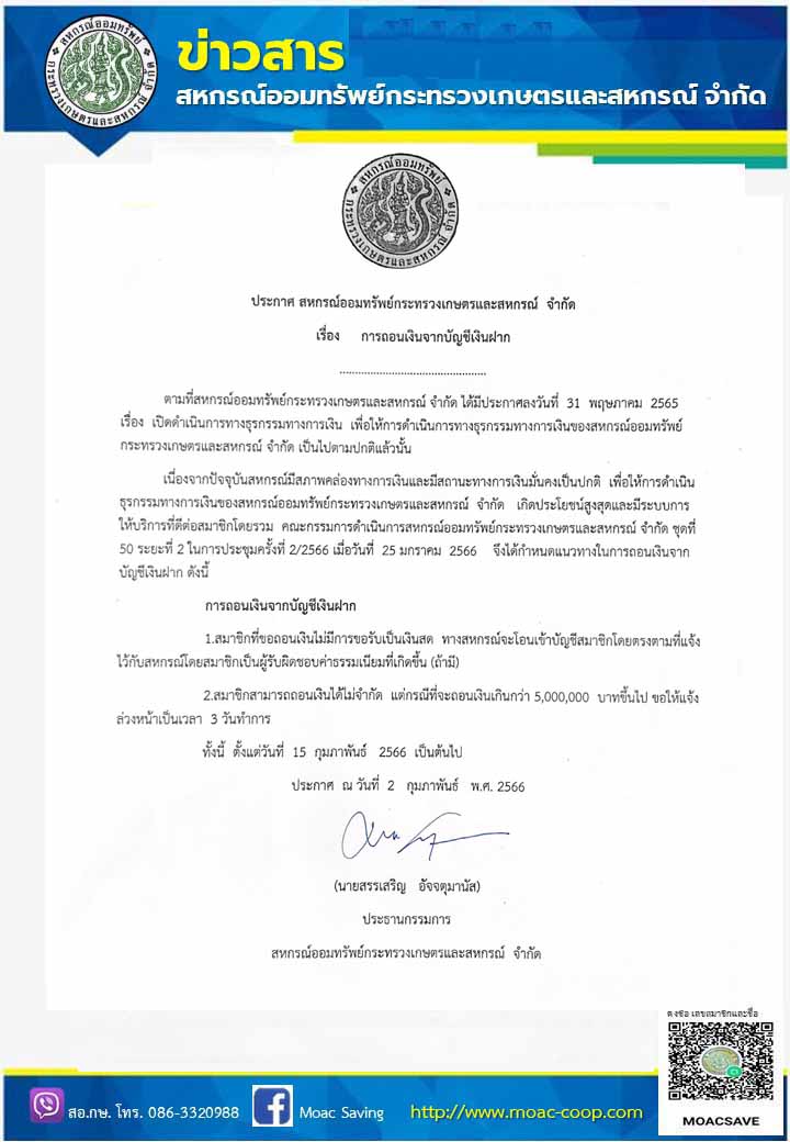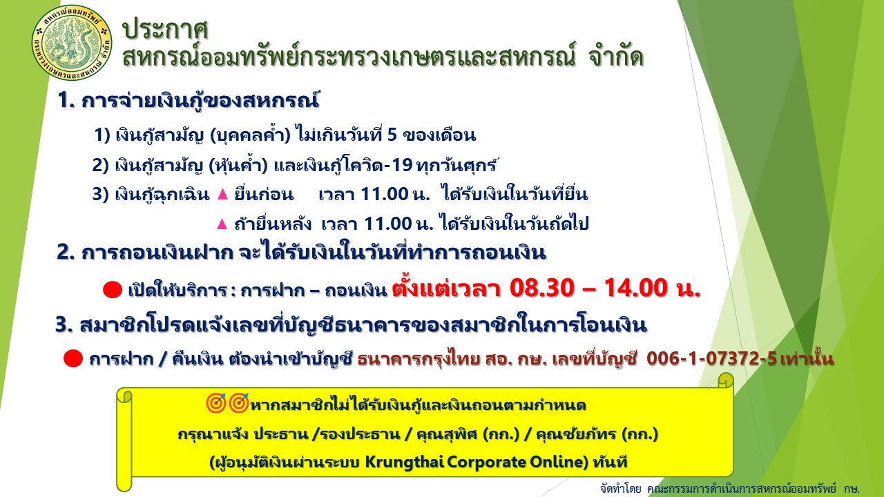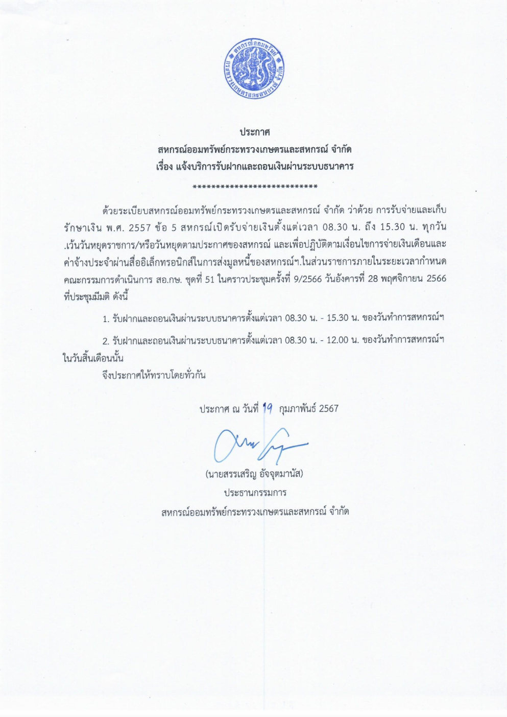 ประกาศ สอ.กษ. การจ่ายเงินกู้ และ การถอนเงินฝาก