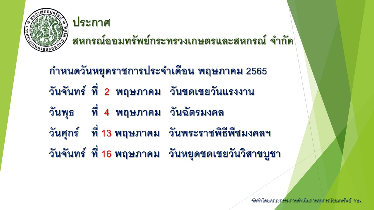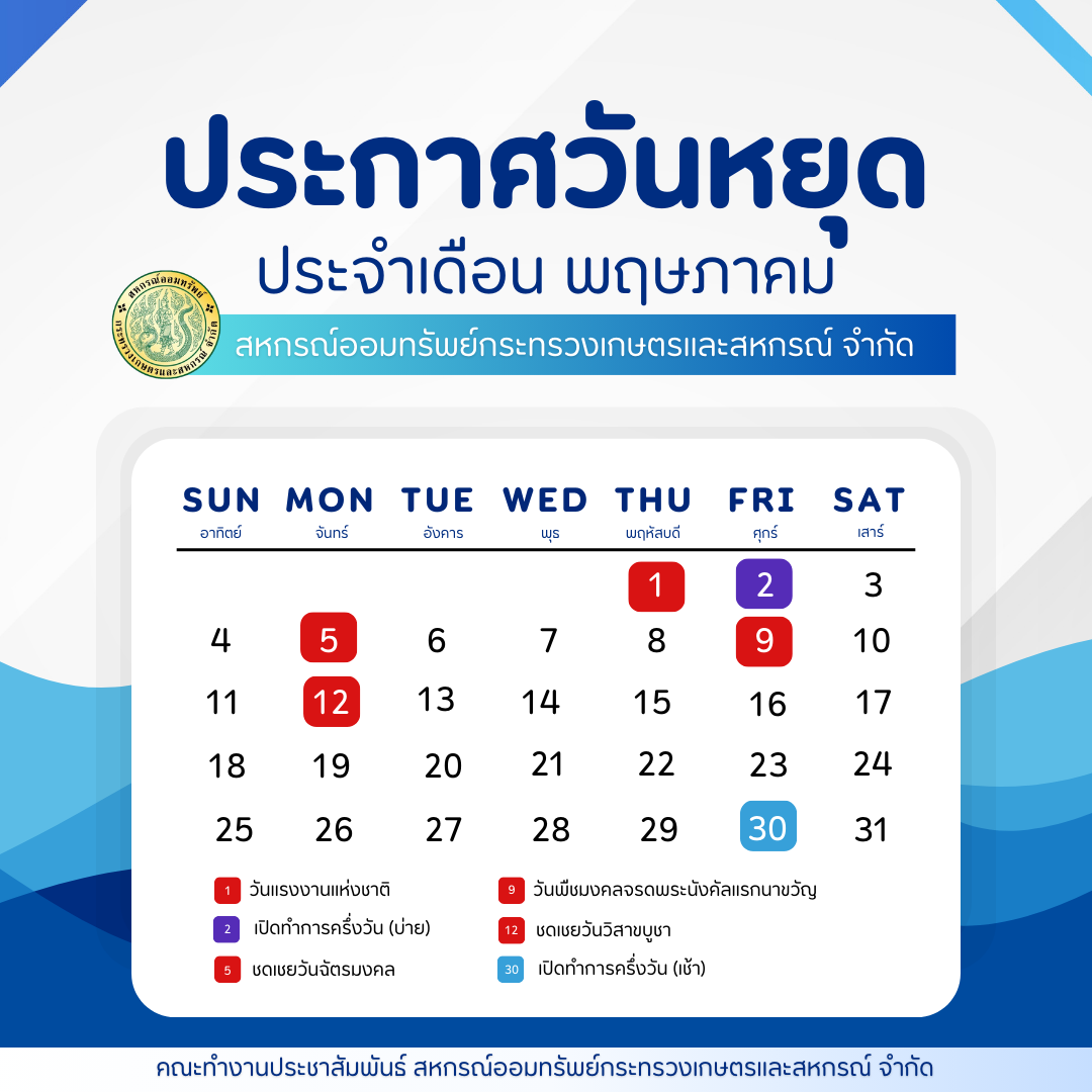 ประกาศวันหยุดประจำเดือน พฤษภาคม 2565