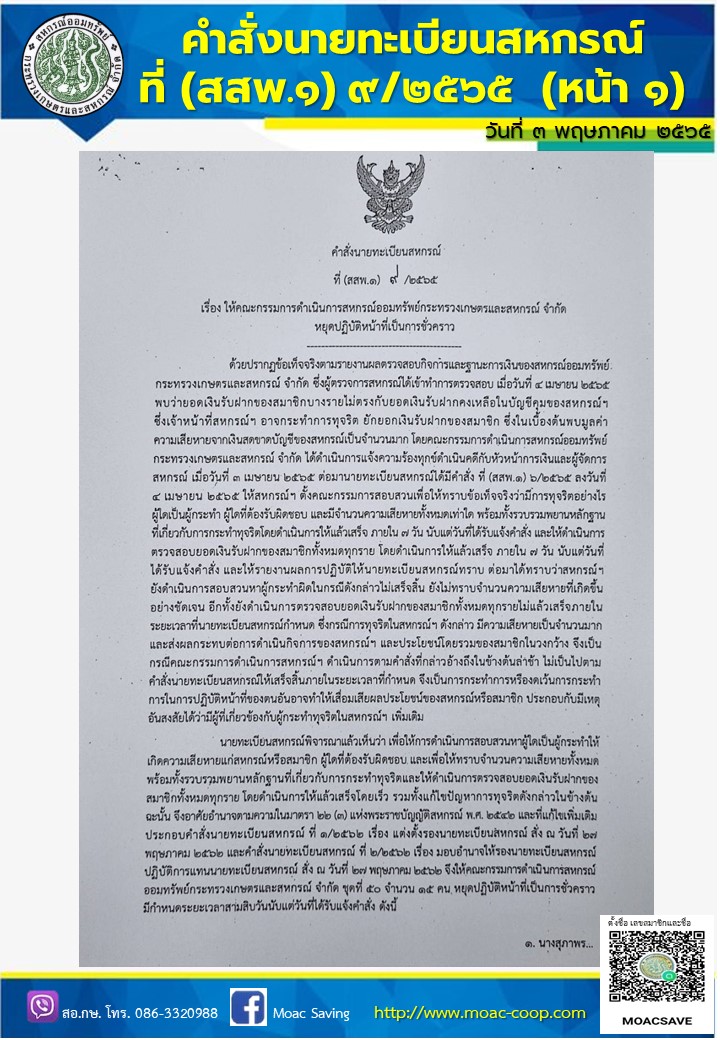 คำสั่งนายทะเบียนสหกรณ์ ให้คณะกรรมการดำเนินการ สอ.กษ. หยุดปฏิบัติหน้าที่เป็นการชั่วคราว