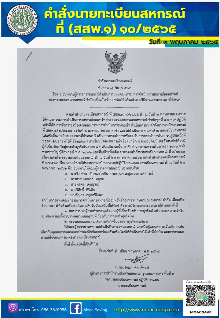 คำสั่งนายทะเบียนสหกรณ์ มอบหมายผู้ตรวจการสหกรณ์ดำเนินการแทนคณะกรรมการดำเนินการ สอ.กษ. เพื่อแก้ไขข้อบกพร่องให้แล้วเสร็จตามวิธีการและระยะเวลาทีกำหนด