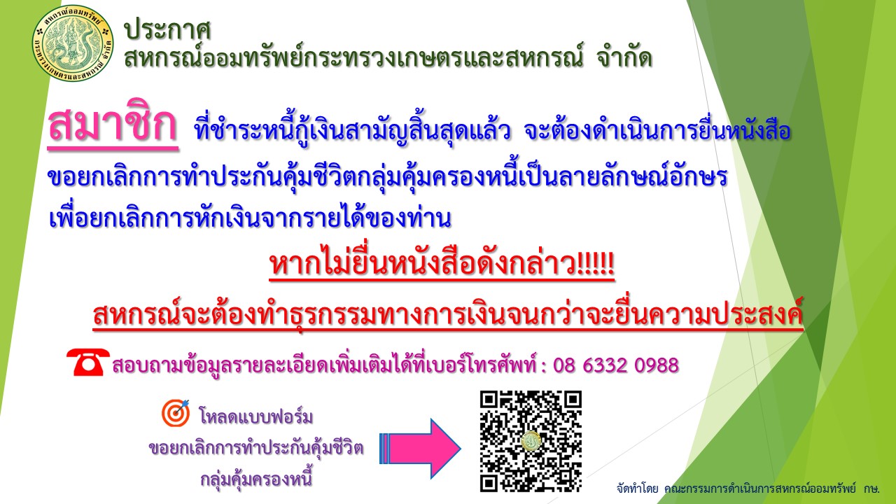 ประชาสัมพันธ์ เรื่อง การชำระคืนเงินกู้ปันผลคืนสุข กรณีเงินปันผลและเงินเฉลี่ยคืนไม่เพียงพอหักชำระหนี้
