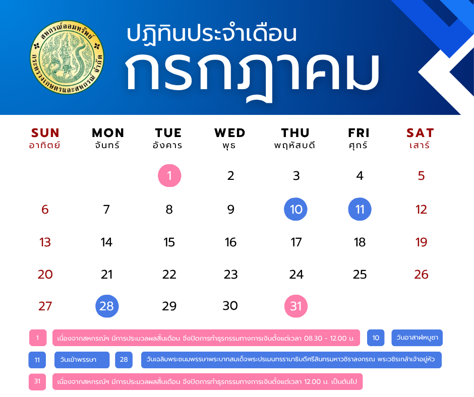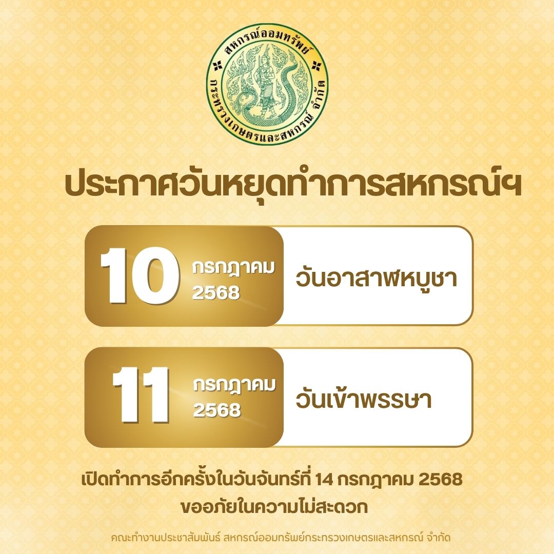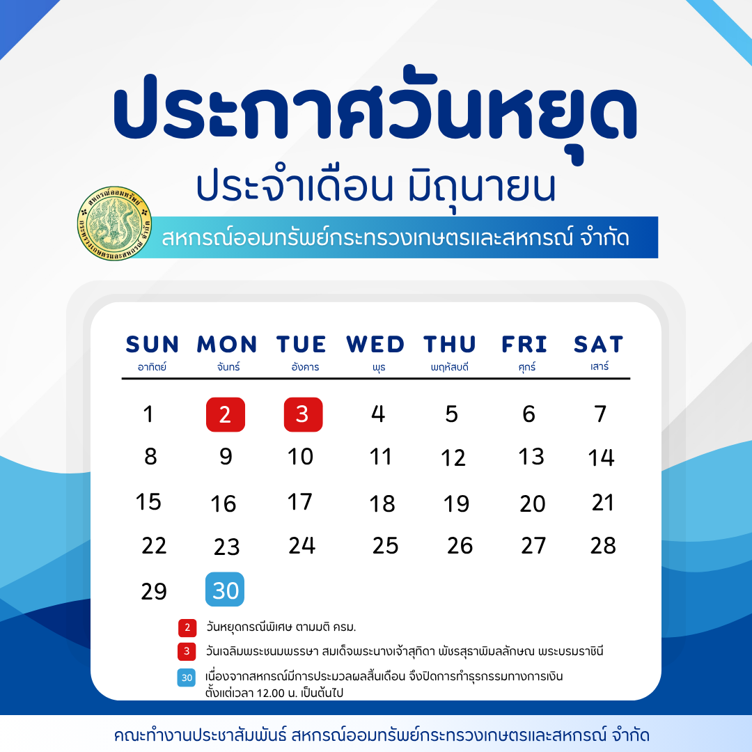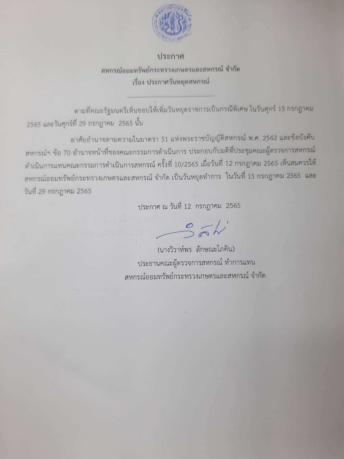 ประกาศวันหยุดทำการสหกรณ์ 15 และ 29 กรกฏาคม 2565