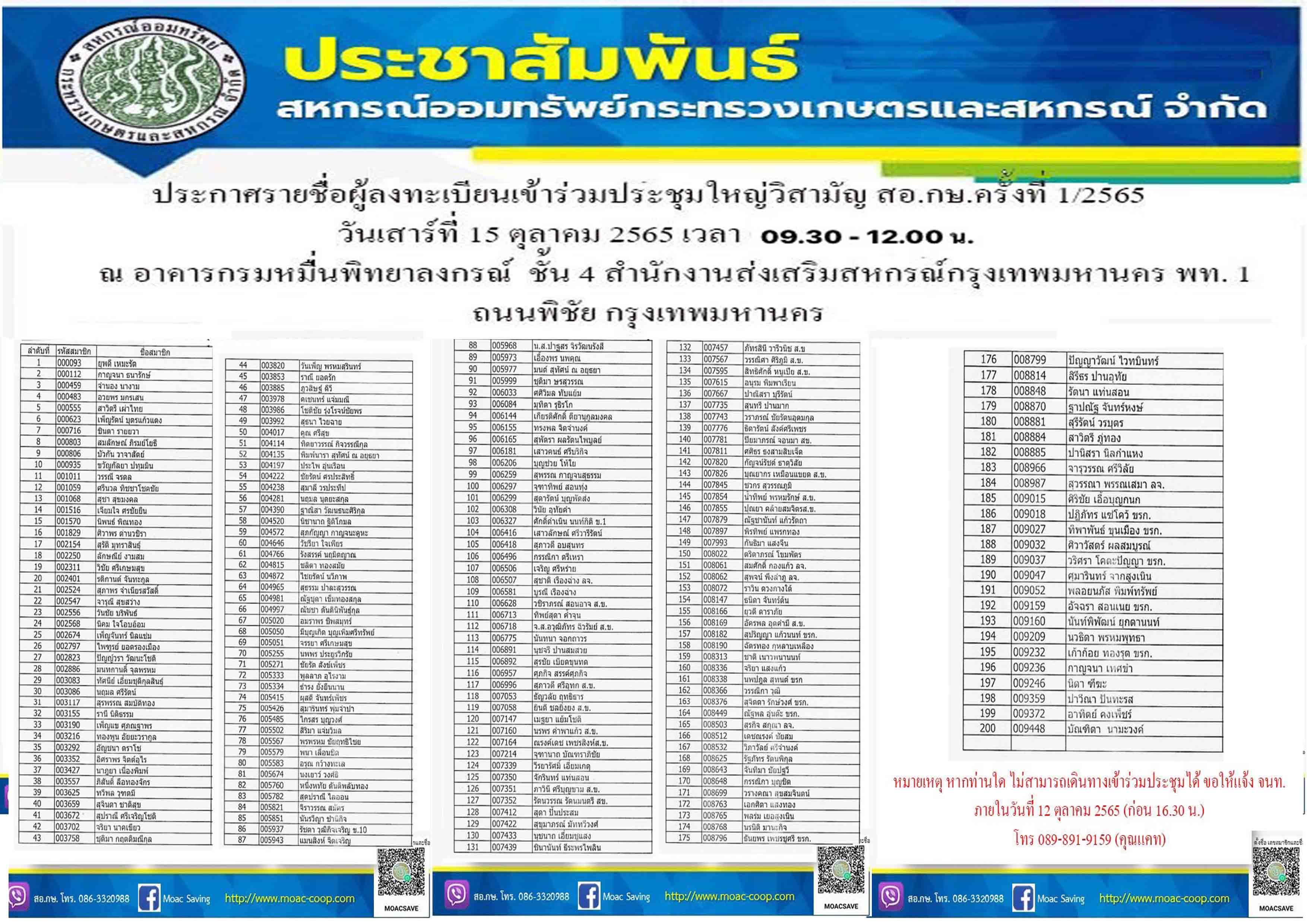 ประกาศรายชื่อผู้ลงทะเบียนเข้าร่วมประชุมใหญ่วิสามัญ ครั้งที่1/2565