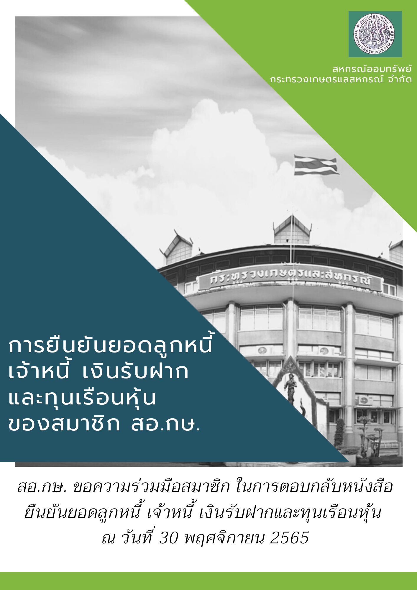 การยืนยันยอดลูกหนี้แจ้าหนี้ เงินรับฝากและทุนเรือนหุ้นสมาชิก สอ.กษ. ข้อมูล ณ วันที่ 30 พฤศจิกายน 2565