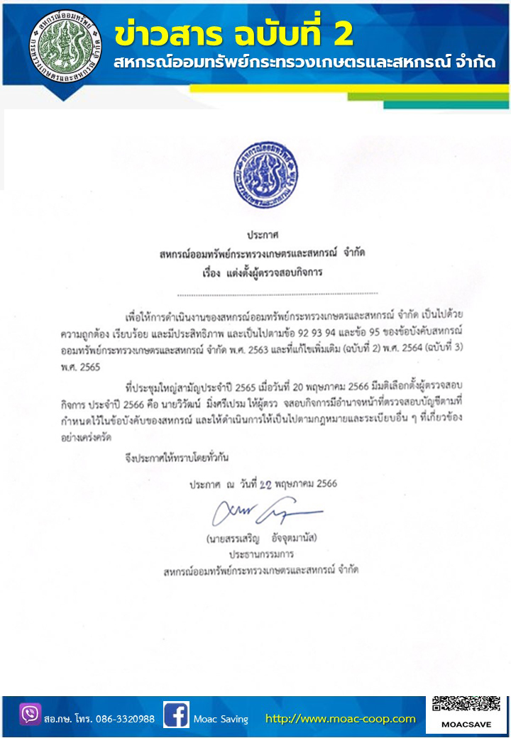ประกาศแต่งตั้งผู้ตรวจสอบกิจการ สอ.กษ.ประจำปี 2566
