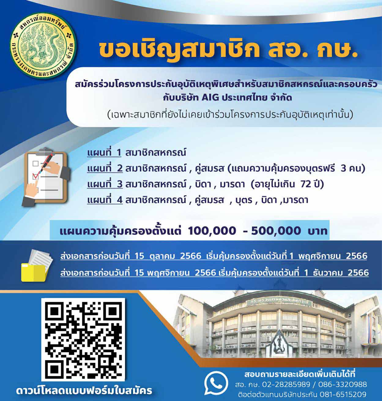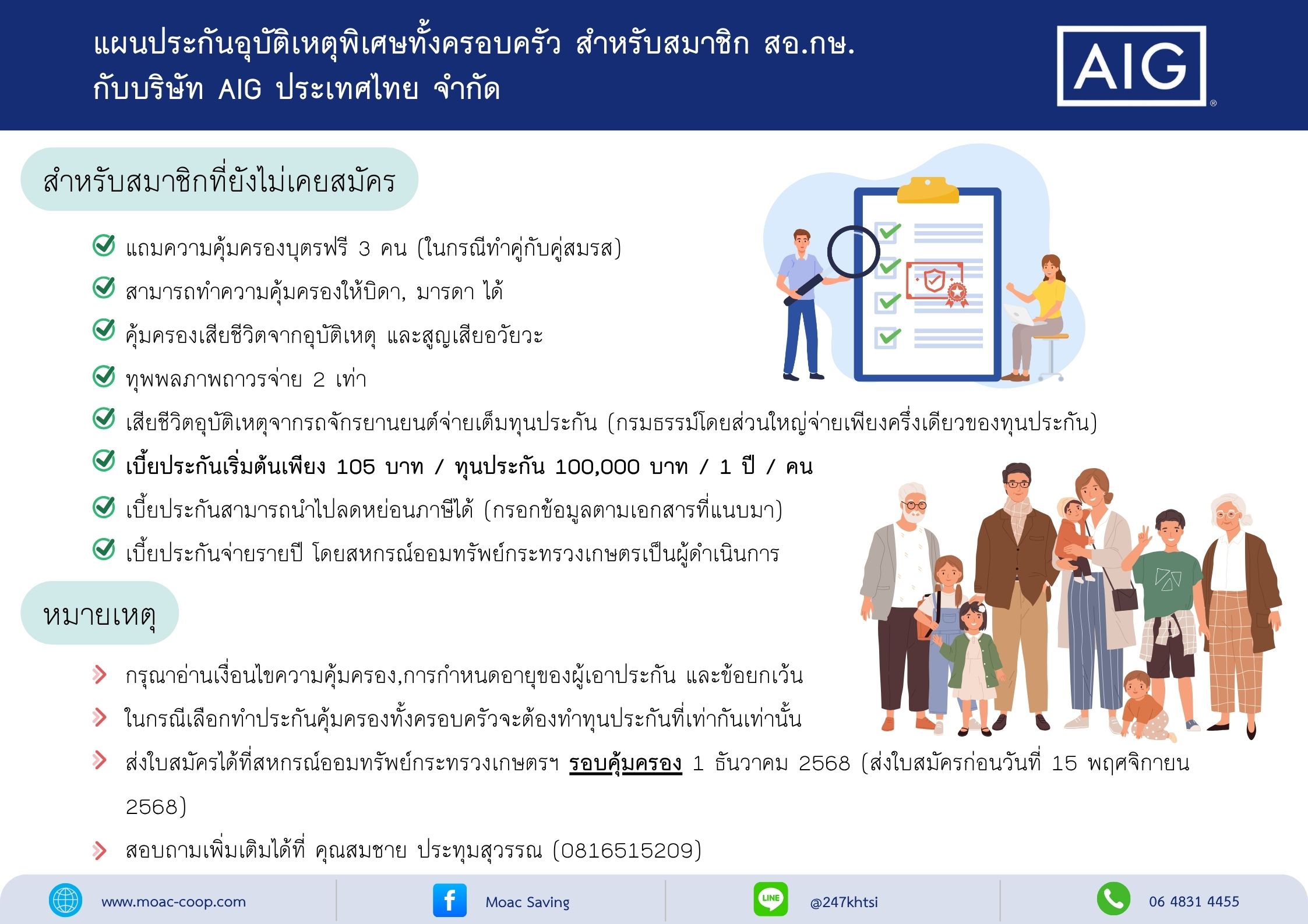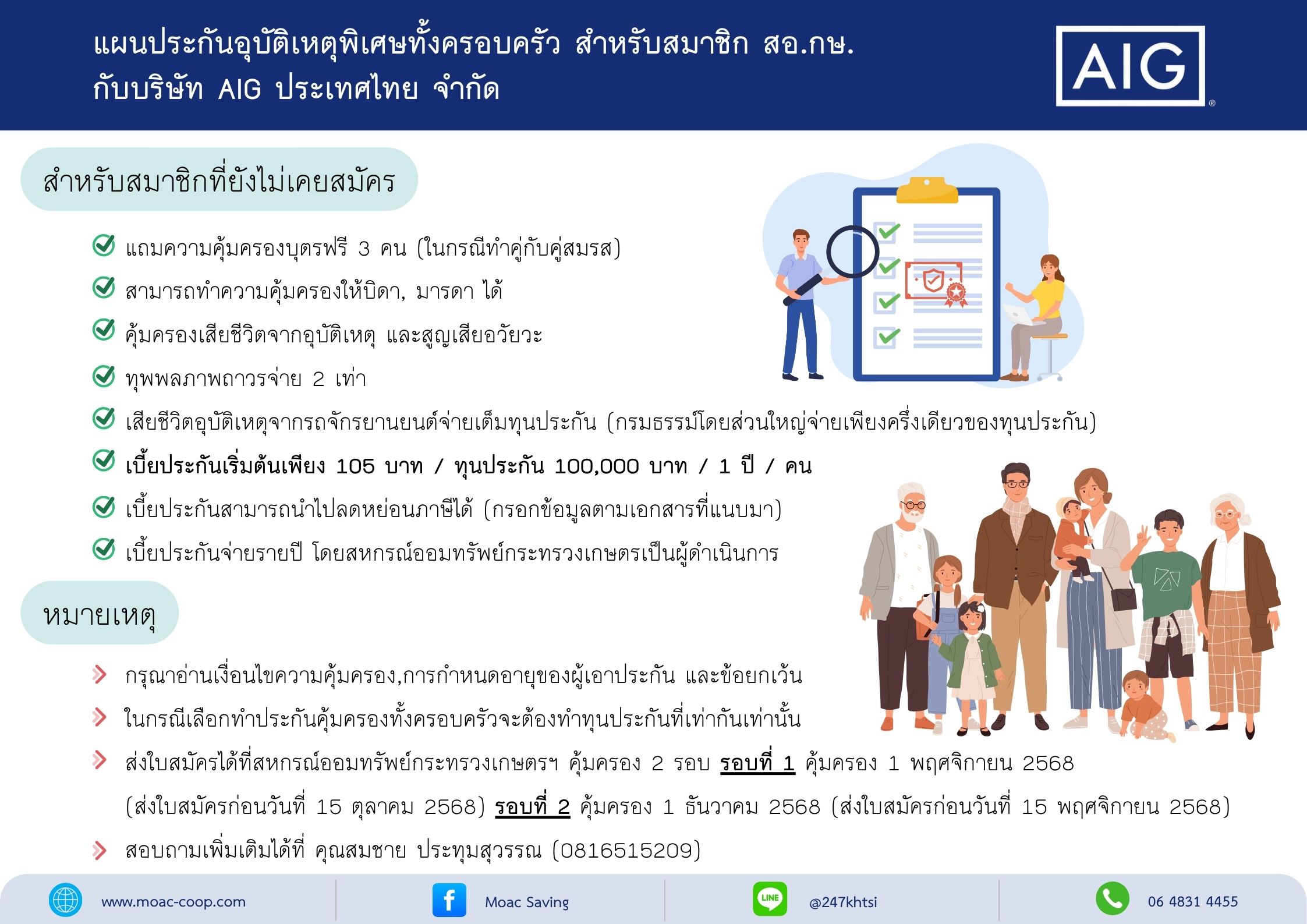 แผนประกันอุบัติเหตุพิเศษทั้งครอบครัว สำหรับสมาชิก สอ.กษ. กับบริษัท AIG ประเทศไทย จำกัด สำหรับสมาชิกที่ยังไม่เคยสมัคร เท่านั้น