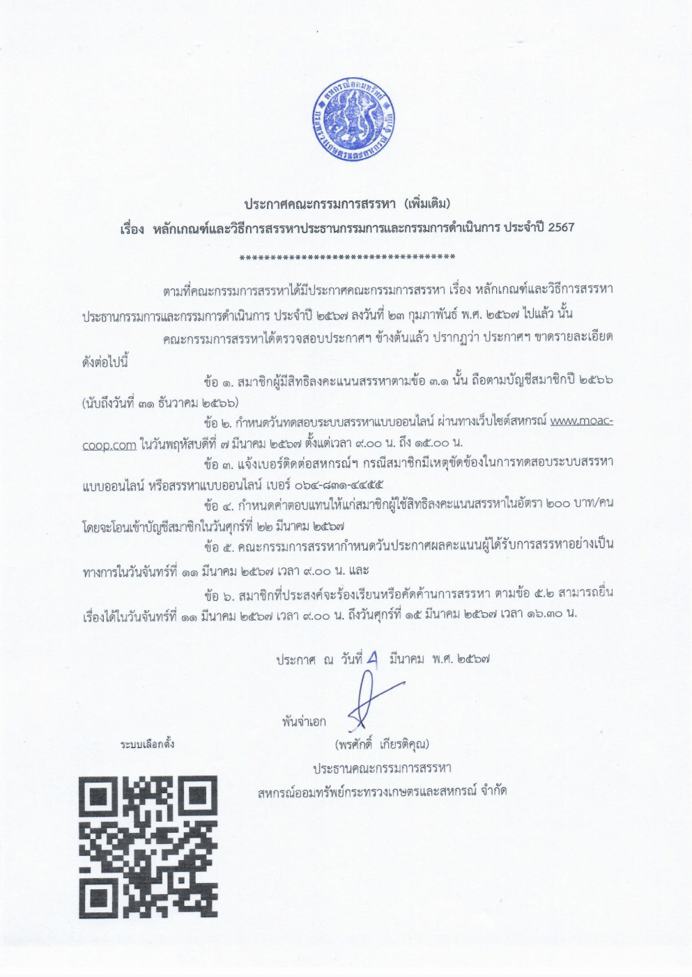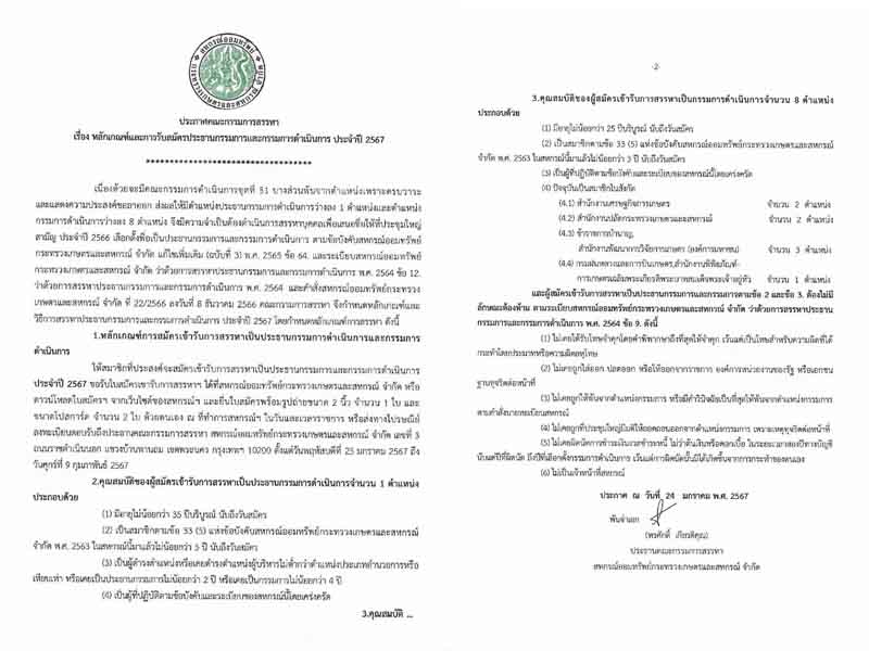 ประกาศคณะกรรมการสรรหา เรื่องหลักเกณฑ์และการรับสมัครประธานกรรมการและกรรมการดำเนินการ ประจำปี 2567