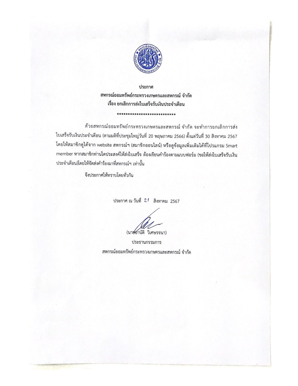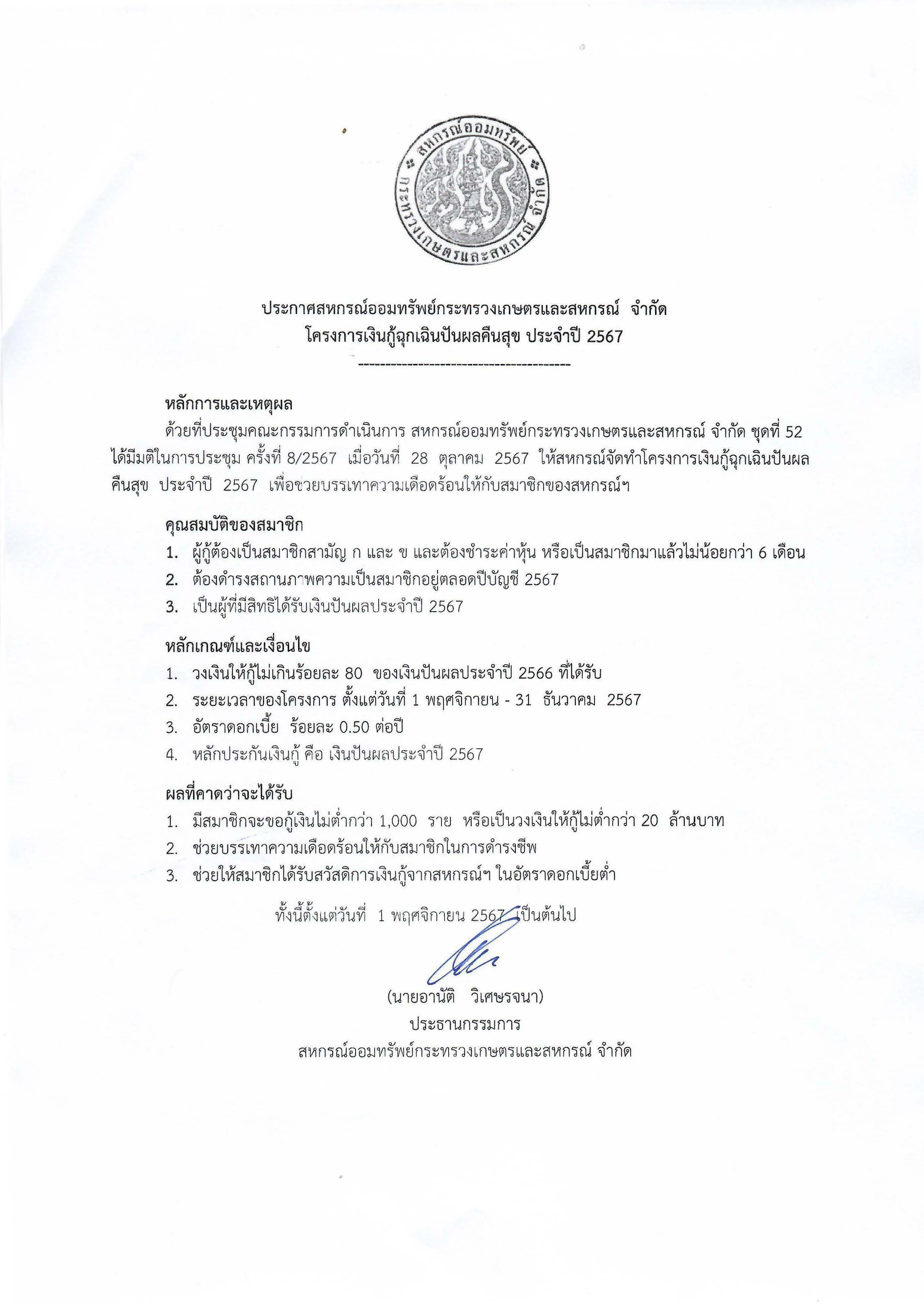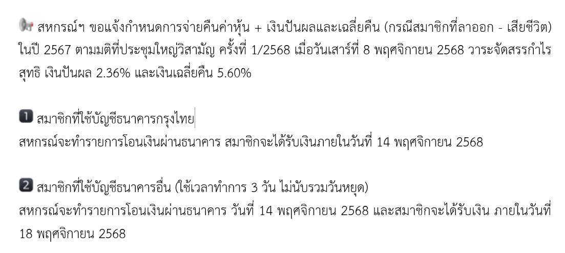 แจ้งกำหนดการจ่ายคืนค่าหุ้น + เงินปันผลและเฉลี่ยคืน (กรณีสมาชิกที่ลาออก - เสียชีวิต) ในปี 2567