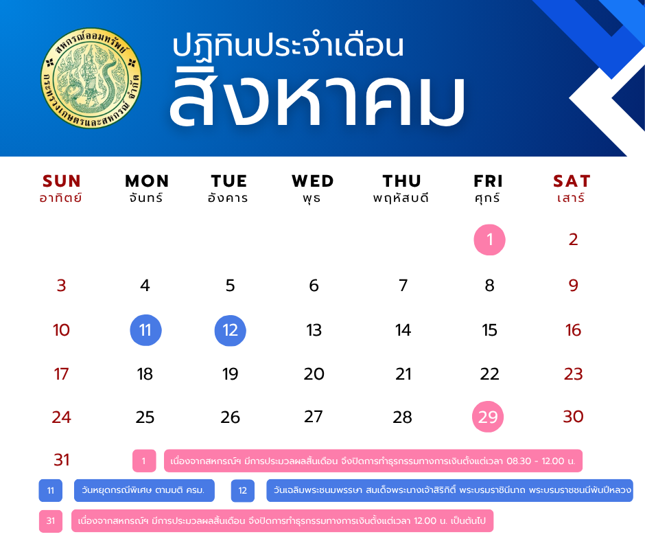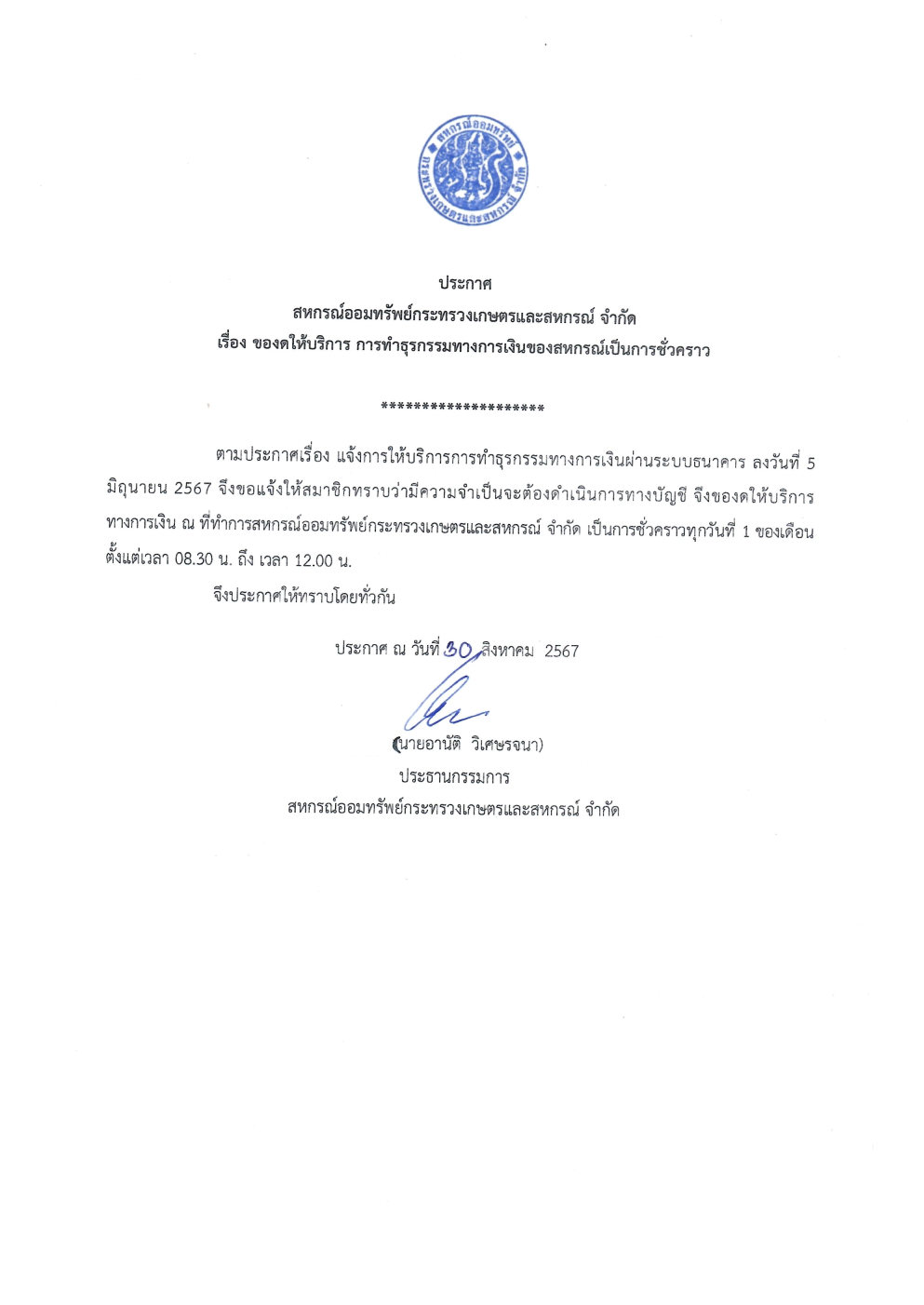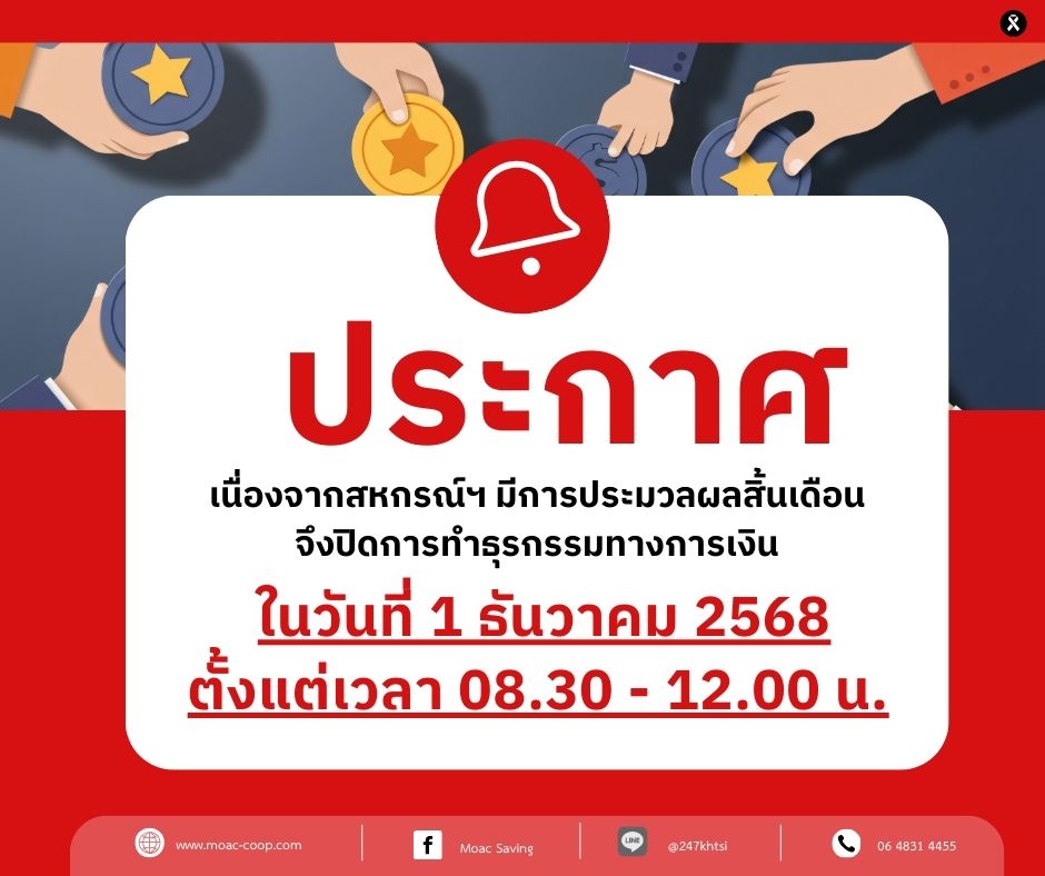 ประกาศ สอ.กษ ปิดการทำธุรกรรมทางการเงิน ในวันที่ 1 ธันวาคม 2568 ตั้งแต่เวลา 08.30 - 12.00 น.