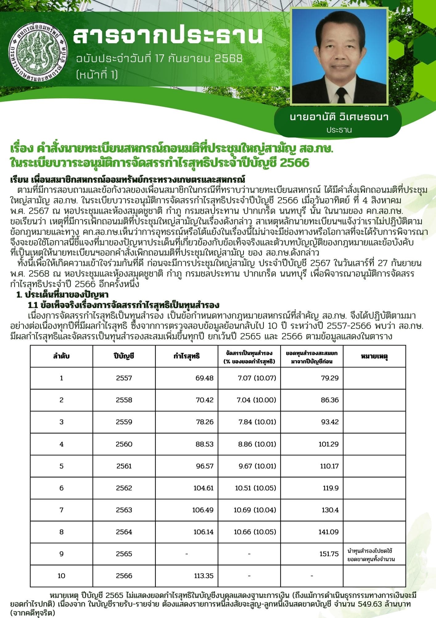 สารจาก สอ.กษ. การทุจริตของเจ้าหน้าที่ , การดำเนินคดีเจ้าหน้าที่ , การบริหารการเงิน , การดำเนินการเกี่ยวกับคำร้องของสมาชิก , มาตรการควบคุมภายในเกี่ยวกับการเงิน , ขอความร่วมมือสมาชิกทุกท่าน