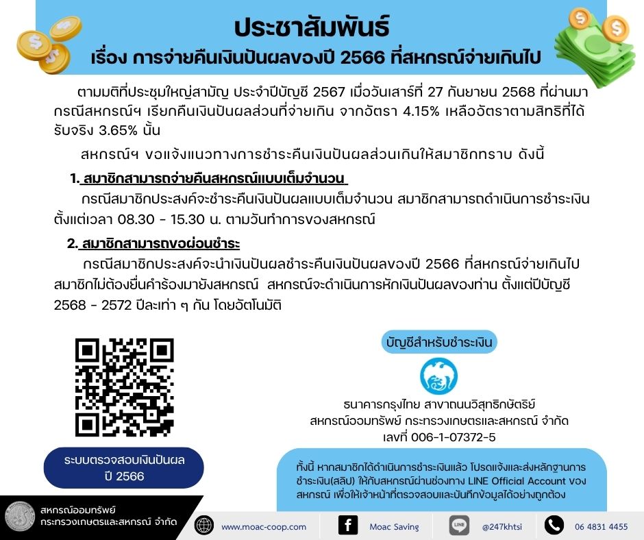ประชาสัมพันธ์ เรื่อง การจ่ายคืนเงินปันผลของปี 2566 ที่สหกรณ์จ่ายเกินไป