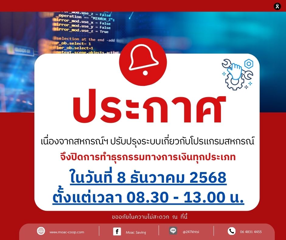 ประกาศ แจ้งปิดให้บริการ วันที่ 30 ธันวาคม 2568 ตั้งแต่เวลา 13.00 น. เป็นต้นไป