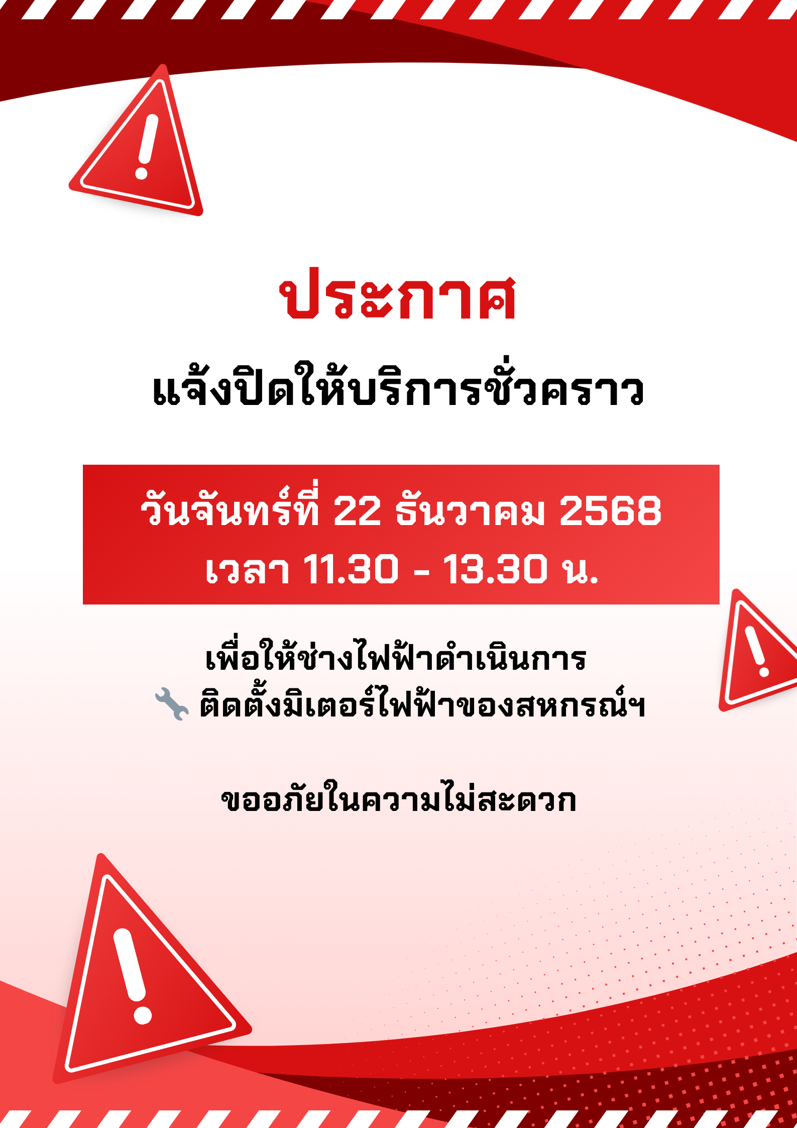 ประกาศ แจ้งปิดให้บริการชั่วคราว วันจันทร์ที่ 22 ธันวาคม 2568 เวลา 11.30 - 13.30 น.