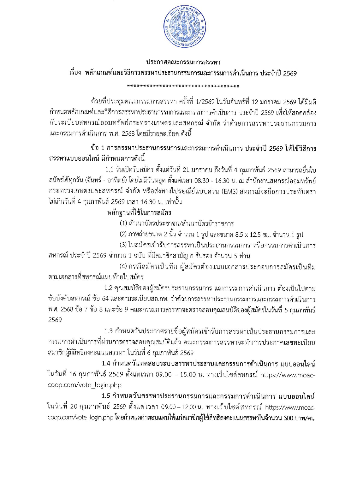ประกาศ สอ.กษ. เรื่อง หลักเกณฑ์และวิธีการสรรหาประธานกรรมการและกรรมการดำเนินการ ประจำปี 2569