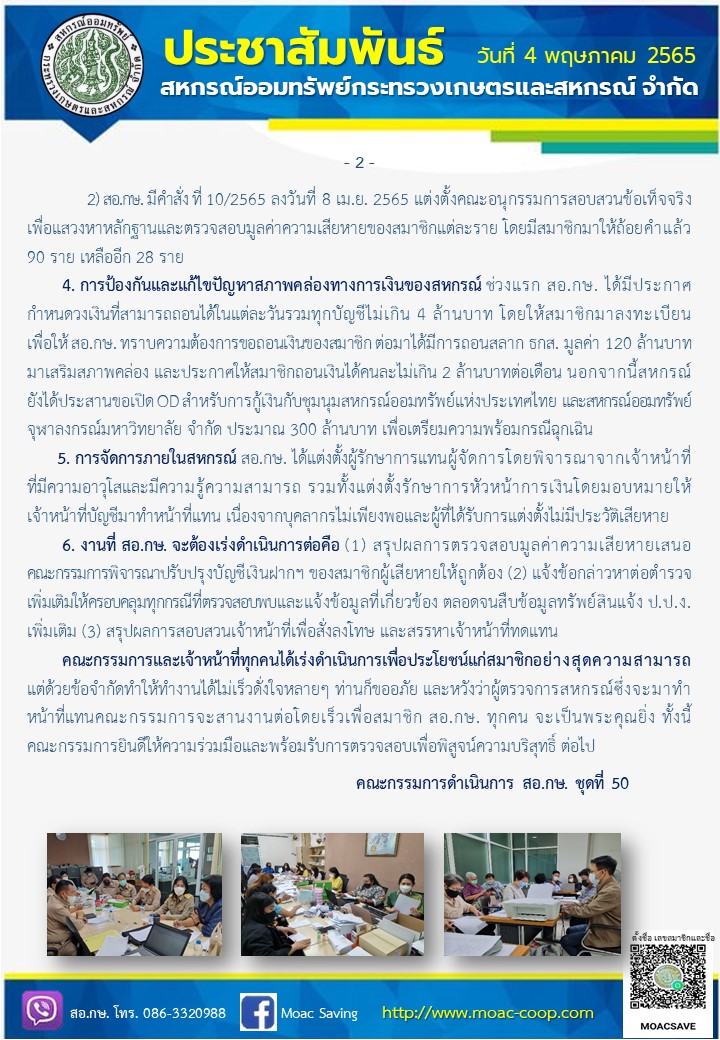 รายงานความก้าวหน้าในการแก้ไขปัญหา ของ คณะกรรมการดำเนินการ สอ.กษ. ชุดที่ 50 ณ วันที่ 4 พฤษภาคม 2565